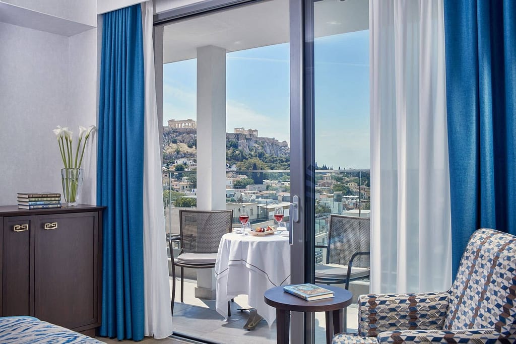 Rooms: The rooms are spacious, clean, and well-equipped, with modern amenities such as smart TVs, minibars, and marble bathrooms. The rooms range from 18/25/32 sqm for the standard and deluxe to 40-50 sqm for the suites- some rooms offer a stunning view of the Acropolis, a significant plus​. The blue, teal, grey, and white color palette used in the rooms is relaxing to the eye evoking the blue hues of the Aegean. If the view is an important part of your experience, ensure that you have selected a room with a view at the booking stage (and I would also recommend calling the hotel to confirm!)