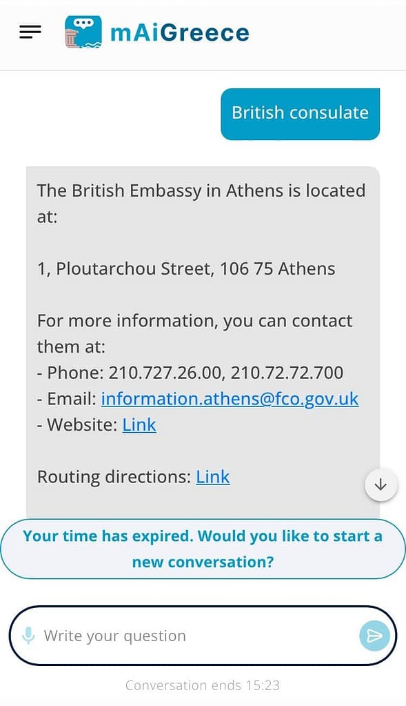 - As the app is still in beta mode, it lacks nuance. Here is an example – there are definition differences between a hospital, a health center, and a private clinic. Of course, during an emergency, you really don’t care about the subtle differences in terminology, and you are more likely to ask for a hospital. If you ask for “Hospital in Chania,” the generated answer will be the General Public Hospital of Chania. Now, in the case of Chania, it is the city name and the prefecture, so that means you can be anywhere. The app will provide additional information if you ask more specific questions. For example, “ Additional hospitals in Chania” will continue with a selection of health centers that are more locational and spread around the prefecture. Private clinic information is still excluded at this point, and you may need to specify and ask again. In the case of an emergency when a hospital is required, it may be challenging to think of all the nuances and variations- in such cases, for example, asking for “ hospitals and health centers near me” might be more helpful to avoid having to clarify and become overly specific. This is where the geolocational features of the mAIGreece application might come in handy.
