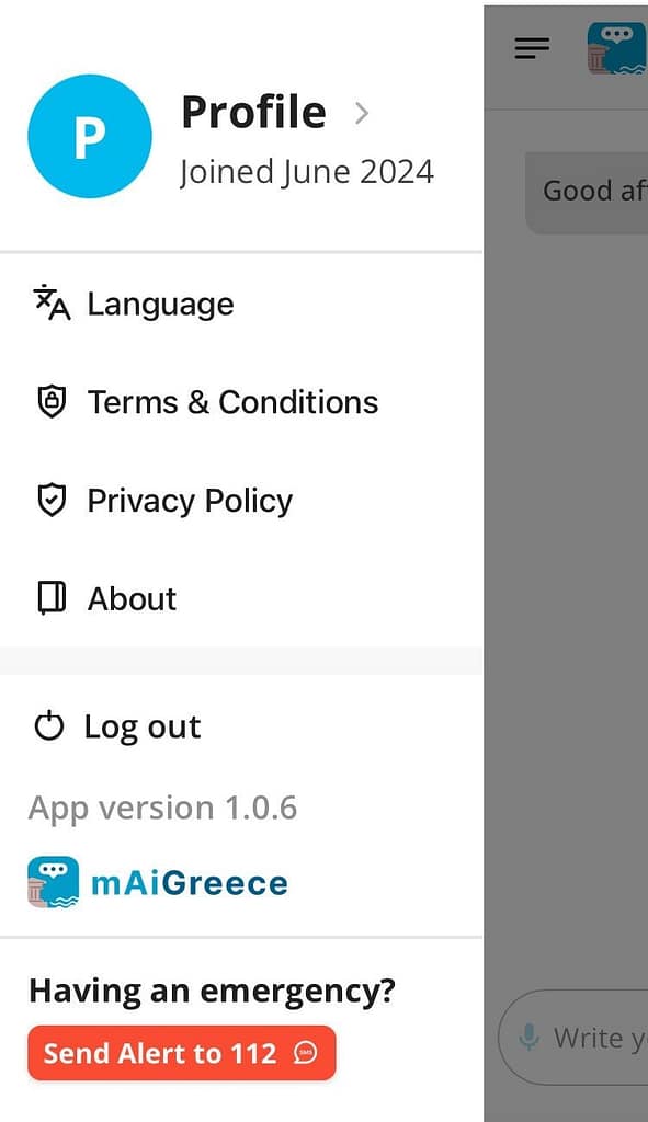 The mAIGreece application includes the capability to send an SMS to the operations center of the Ministry of Civil Protection via the 112 button, sending the sender’s geographic location for immediate assistance.