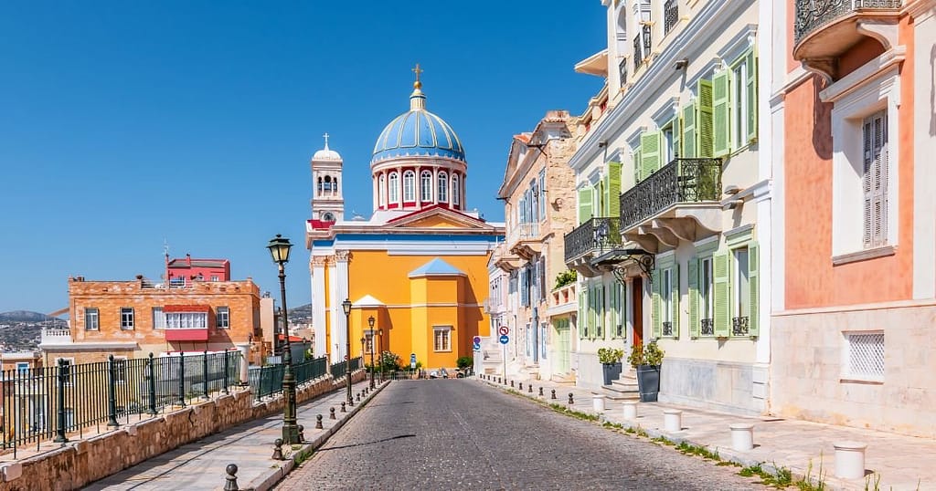 Beyond Ermoupoli, Syros offers numerous interesting sights and activities for visitors. The island is home to beautiful beaches such as Galissas, Kini, and Delfini, where crystal-clear waters and golden sands create perfect spots for relaxation and swimming. Landmarks like the Apollon Theater , a miniature replica of La Scala in Milan, and the Church of Saint Nicholas, with its impressive dome and stunning interior, are must-see attractions. The medieval settlement of Ano Syros, on a hilltop, provides breathtaking views and a charming labyrinth of narrow streets, whitewashed houses, and tavernas. Syros promises a memorable experience for every traveler.
